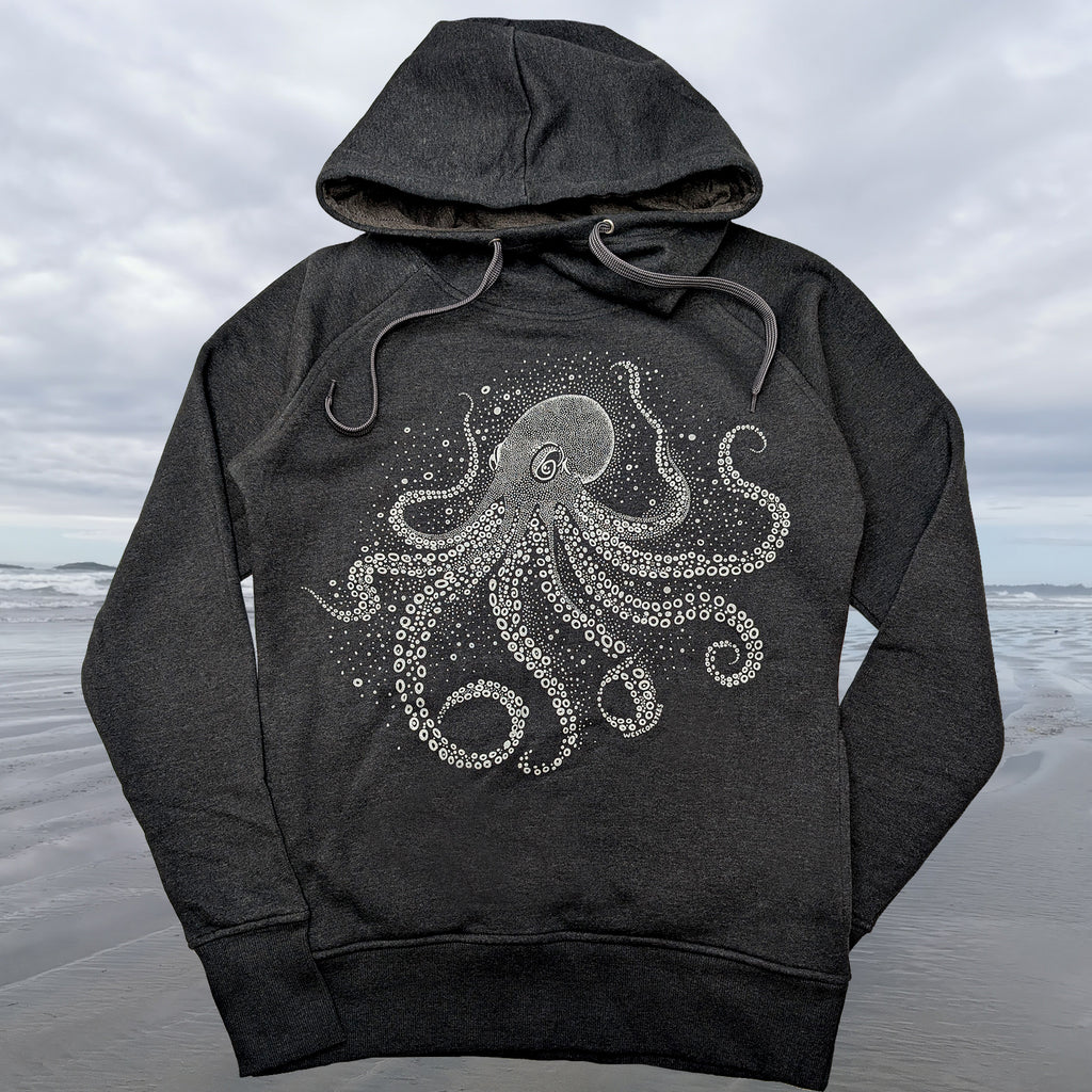 Star Octopus design is printed printed on an ultrasoft and cozy thick 15.7-oz, 80/20 combed cotton/polyester fleece hoodie featuring a jersey lined high neck hood with contrast drawstring, side pockets with jersey lining, thumbhole at cuffs and an extra long necked hood to keep you warm and cozy in colder weather.